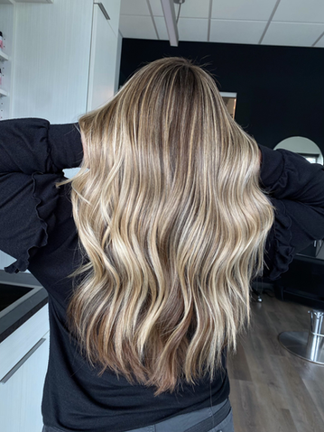 Custom blonding technique to achieve a lived in seamless blend. The full focuses on brightening the entire head. Root shadow, glaze, blow dry & style included.